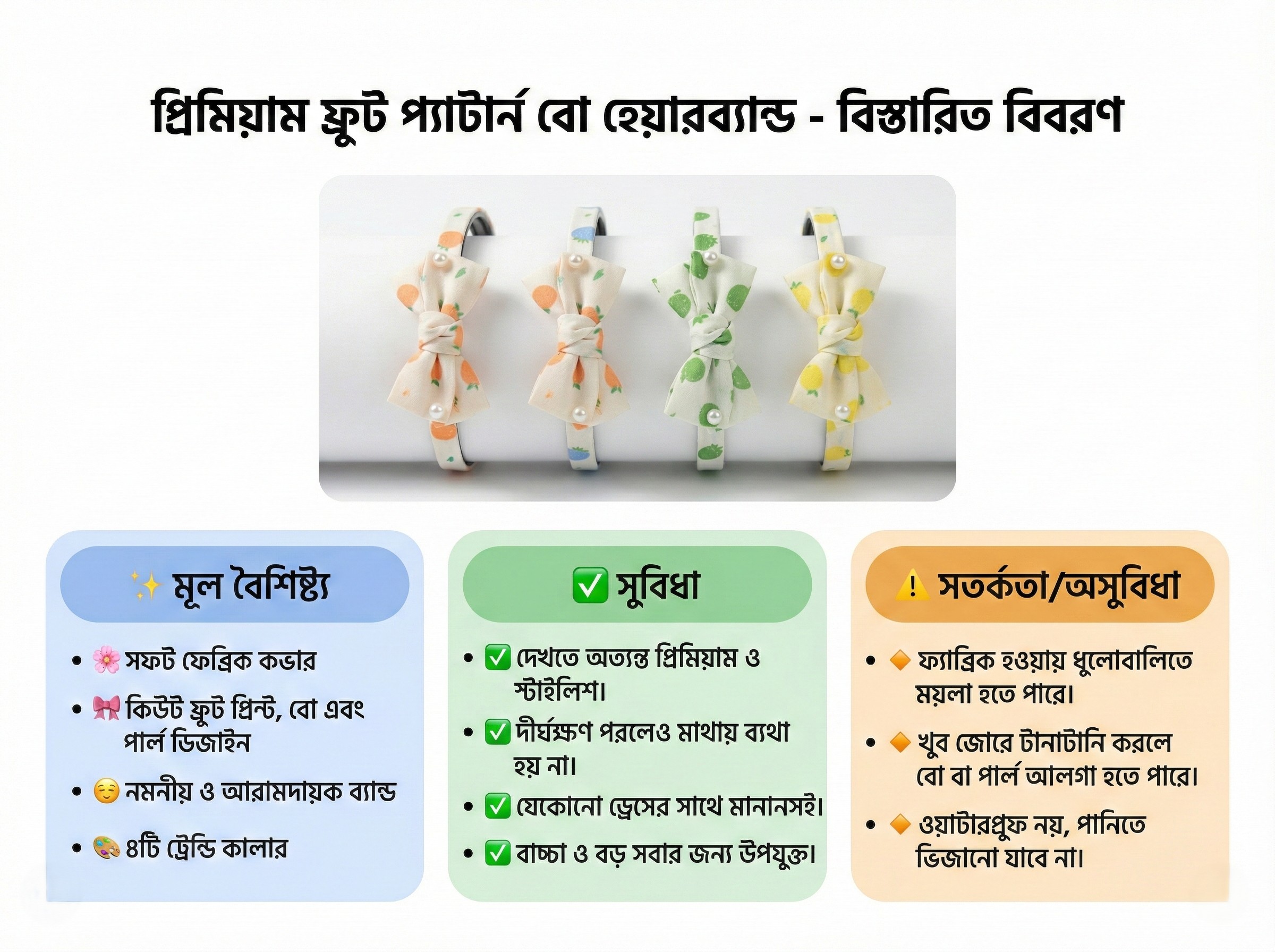 🌟 ইউনিক ডিজাইন: সাধারণ একরঙা ব্যান্ডের বদলে এই ফ্রুট প্রিন্টগুলো খুব সতেজ এবং ট্রেন্ডি লুক দেয়। এর সাথে থাকা 'বো' এবং ছোট্ট 'মুক্তা' ডিজাইনটি একে বাজারের অন্যান্য ব্যান্ড থেকে আলাদা করেছে।